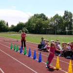 Bei strahlendem Sonnenschein und nach einer gemeinsamen Erwärmung zeigten die Kinder vor den Augen der anfeuernden Eltern und Großeltern bei den Diziplinen Schlängellauf, Sprung über das Seil, und Ballzielwurf ihr Bestes. Als vierte Übung kam in diesem Jahr der einbeinige Sprung mit in das Programm. Darüber hinaus probierten sich die kleinen Olympioniken beim Seilspringen und Eierlaufen.